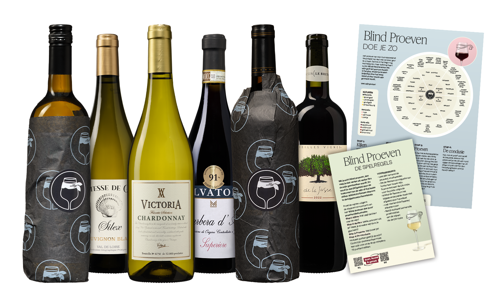 Ook blind leren proeven? Dat kan met het ‘Blind proeven doe je zo! Wijnpakket’. Nodig vrienden en familie uit en wikkel de flessen in de bijgeleverde wikkels. Kunnen ze proeven welke wijn het is?