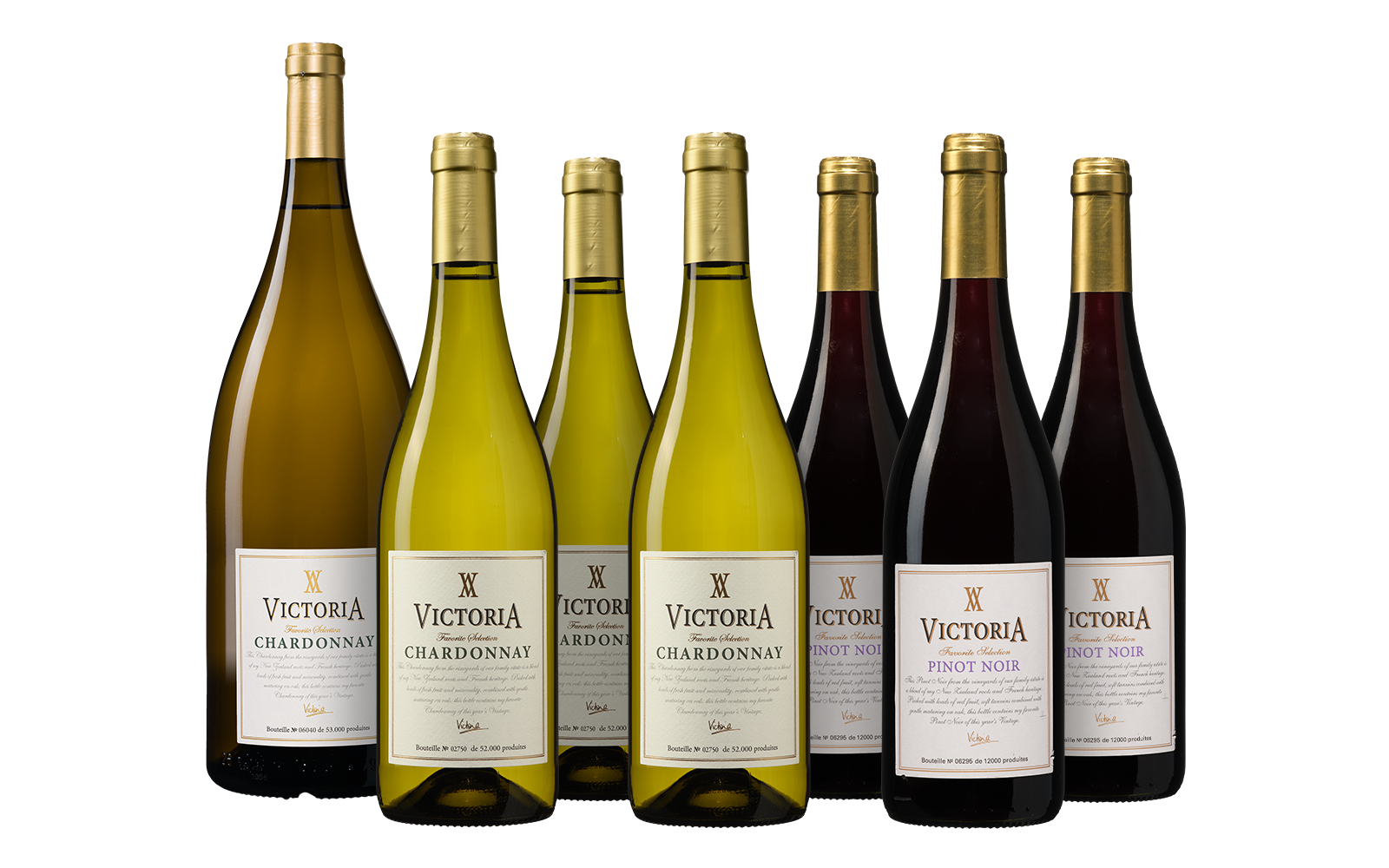 Drie flessen Victoria’s ‘Favorite Selection’ Chardonnay, drie flessen idem dito Pinot Noir mét een Magnumfles (1,5L) van de Chardonnay! Ideaal probeerpakket, met Victoria haar favorieten. Proost!